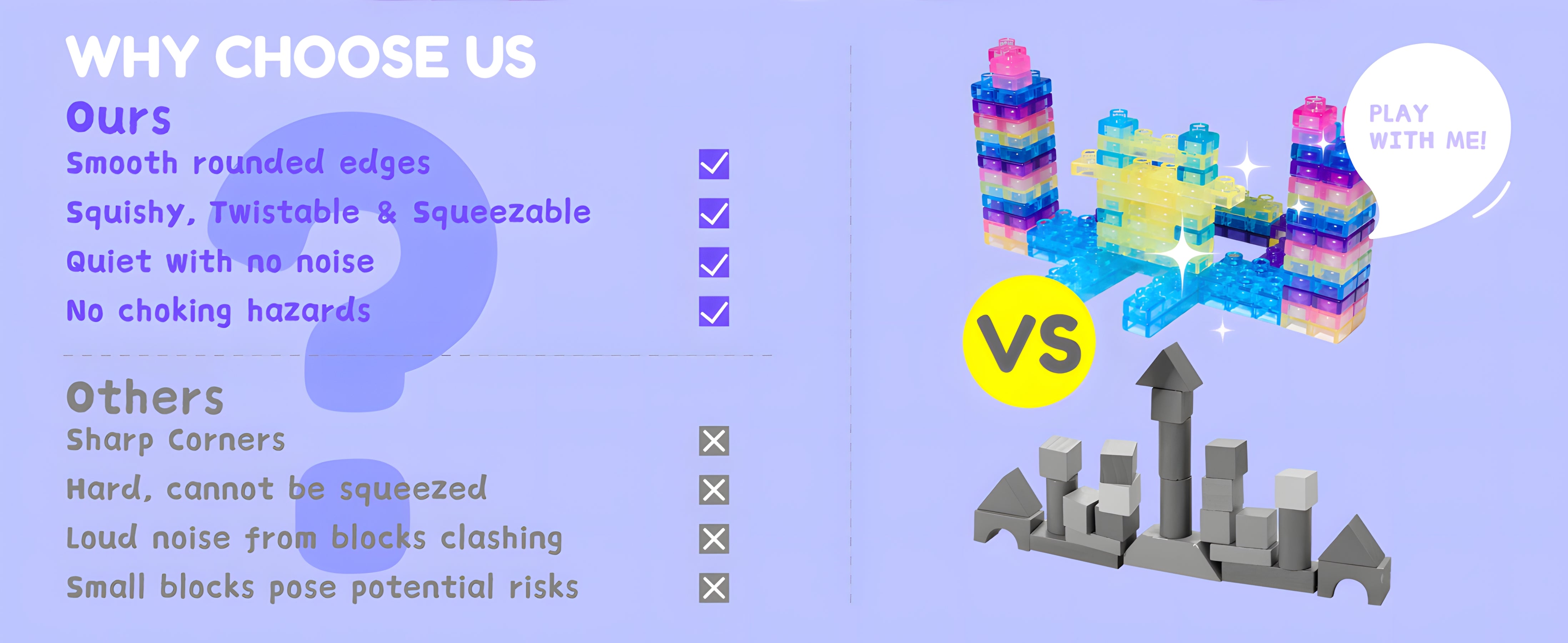 Elastic blocks that bounce back when squeezed or thrown. Built to handle drops, twists, and energetic play without breaking.